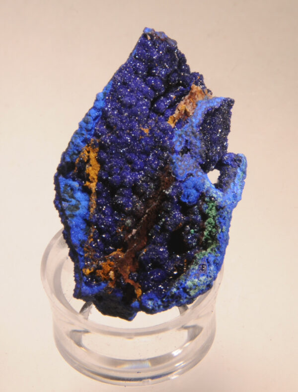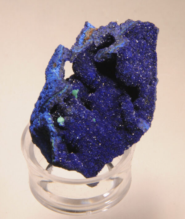 A lovely miniature of bright blue azurite, with nicely contrasting green accessory malachite, from the famous Lavender Pit in Bisbee, Arizona, USA, with a De Natura label.