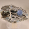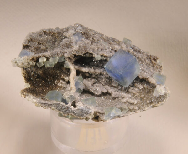 A stunning bright blue fluorite cube, with several smaller pale blue cubes, perched atop a sparkly gray matrix, from the Yaogangxian Mine in Hunan, China.