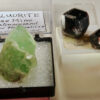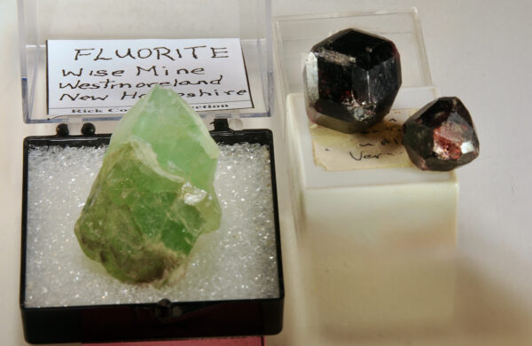 Bundle of two classic minerals: Green fluorite from the Wise Mine in Westmoreland, New Hampshire, USA, and almandine garnets from the Stikine River, Alaska, USA.
