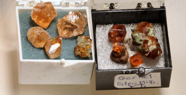 Assortment of gemmy orange-brown grossular garnets from the Jeffrey Mine, Quebec, Canada.