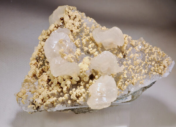 White calcite on a bed of quartz and tan dolomite from the Herja Mine, Chiuzbaia, Baia Mare, Maramures County, Romania. The calcite shows an unusual curved sheath habit, essentially upturned half-rosettes, which is one of the rarer habits from this classic European locality. Excellent provenance—from the Stephen Gerome collection, via Fabre Minerals, ex. Francesco Stoppani (with label).