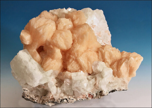 Cabinet specimen of peach-colored stilbite and white apophyllite from India.