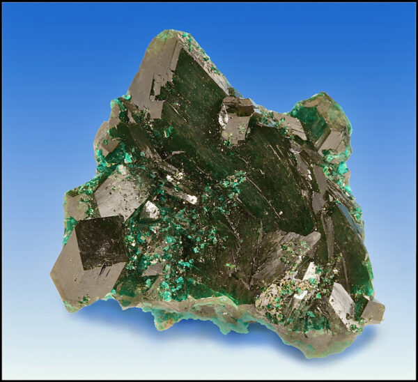 Large crystals of bright green dioptase from the Kaokoveld Plateau, Kunene Region, Namibia. Unusually large, deep green crystals in pristine condition.