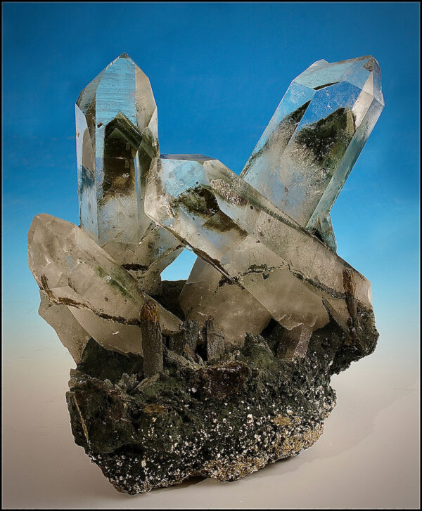 Super showy cabinet specimen of pristine, water-clear quartz with prominent chlorite phantoms, from the Zhob District in Baluchistan, Pakistan.