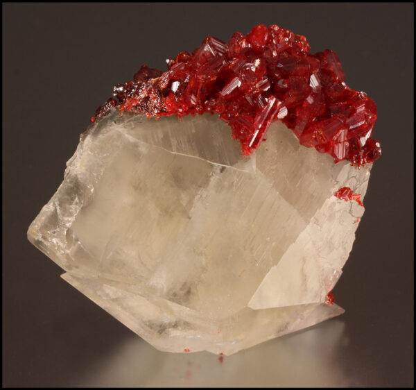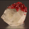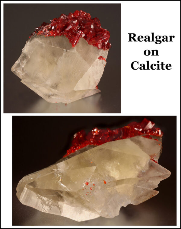 Bright red realgar on shiny translucent white calcite from the Shi Meng Mine in Hunan, China. Trafford-Flynn label.