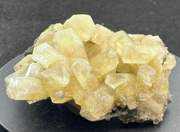 Classic pale yellow “nailhead” calcite crystals from the Sweetwater Mine in Ellington, Missouri, USA. Rutgers University Geology Museum label.