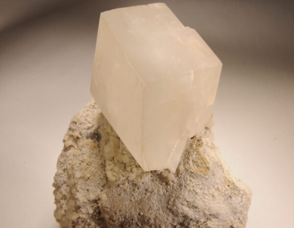 A showy large white calcite rhomb on matrix, from the Tri-State District, with an EarthVision label.