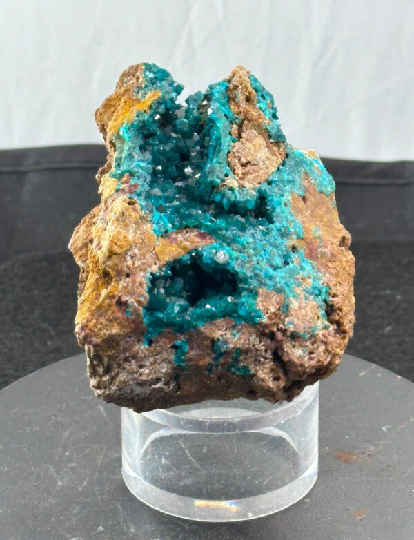 Sparkly green dioptase crystals coating several small vugs in nicely contrasting reddish brown volcanic matrix, from Guchab, Namibia. Metropolis Fine Minerals and Sammlung-Lammer-Loeben labels.