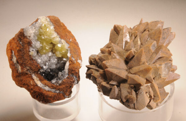 A coarse spray of yellow calcite, stained brown by included iron oxides, from Santa Eulalia, and a colorful specimen of yellow-green adamite (fl. green) on white calcite in a small pocket in orange-brown volcanic matrix from Mapimi (Ex. Rutgers University Geology Museum).