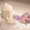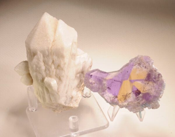 Bright slice of ametrine, showing deep purple amethyst and yellow citrine, from Bolivia (Ex. Carolyn Reynard and with John Betts Fine Minerals label), and a fine specimen of white “cob” quartz from Moosup, near Plainfield, Connecticut, USA.