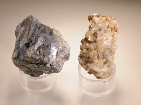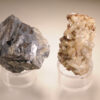 The first is a shiny complex cube of galena, from Iron County, Missouri, USA. The other is a shiny cluster of cream-white cerussite blades from the Flux Mine in the Patagonia Mountains of Arizona, USA, with a StoneTrust label.