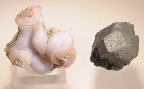 A fine dark greenish-black pseudomorph of chlorite after garnet, locally known as chamosite, from Michigamme, Michigan, and a white chalcedony “rose” from Hidalgo County in New Mexico. Both Ex. Carolyn Reynard.