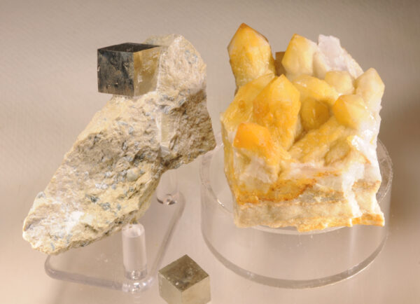 A very aesthetic grouping of pyrite crystals on matrix from Navajun in Spain (repaired, as most of these are, and the smaller cube has become detached). Also a nice small plate of quartz crystals, tinted yellow-orange with iron oxides, from Lunenberg, Massachusetts.