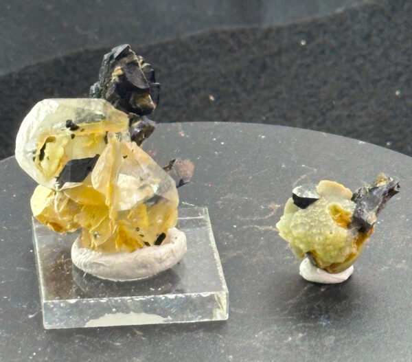 Miniature and thumbnail of coarse babingtonite on green prehnite and white calcite, from the Roncari Quarry, East Granby, Connecticut, USA.