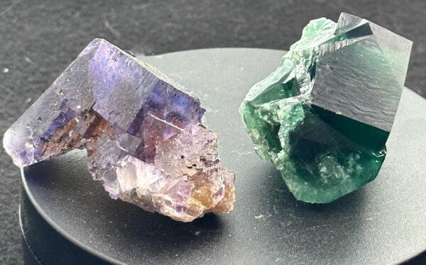 The first is classic dark purple fluorite from Joplin, Missouri, USA, with a label from The Show Case. The second is a superb green fluorite twin from the famous Rogerly Mine in Weardale, England, UK.