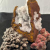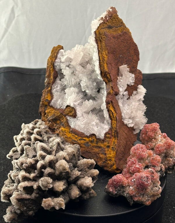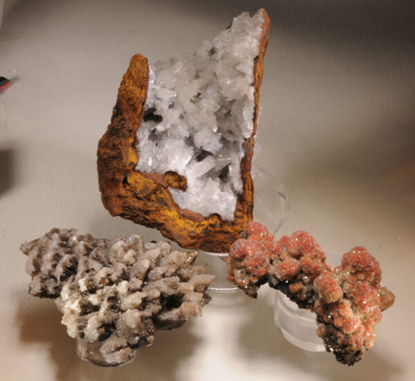 Pearly white hemimorphite on nicely contrasting orange matrix from Mapimi, and two calcites, one with botryoidal masses of micro-calcite with red cores and one with gray dogtooth calcites, both from Santa Eulalia.