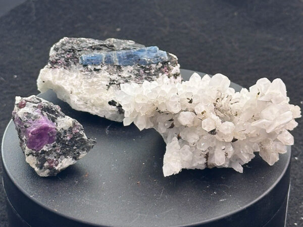 A reddish purple ruby from Karelia (P & H Fluorescent Minerals label), a shiny white cluster of quartz crystals from Dalnegorsk (Stewart’s Minerals label), and a deep blue kyanite in matrix from Karelia (Rocko label).