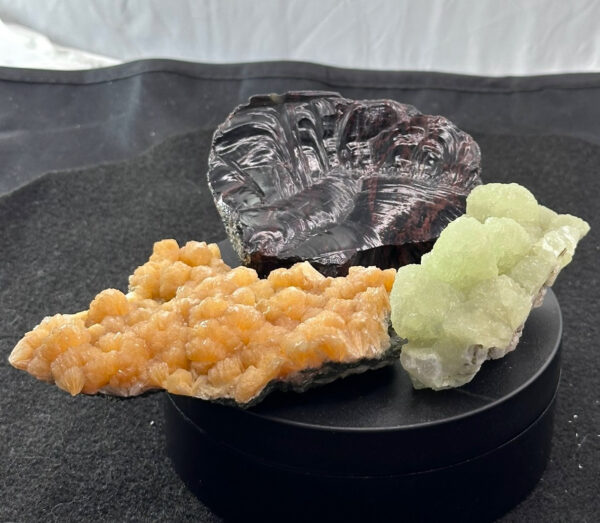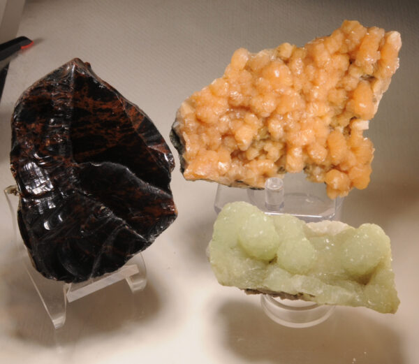 Peach-colored stilbite from the Moore’s Station Quarry, Hopewell Township, Mercer County, New Jersey, USA. Botryoidal green prehnite from the famous Lower New Street Quarry in Paterson, New Jersey, USA. Glossy black obsidian from Glass Mountain in Oregon, USA.