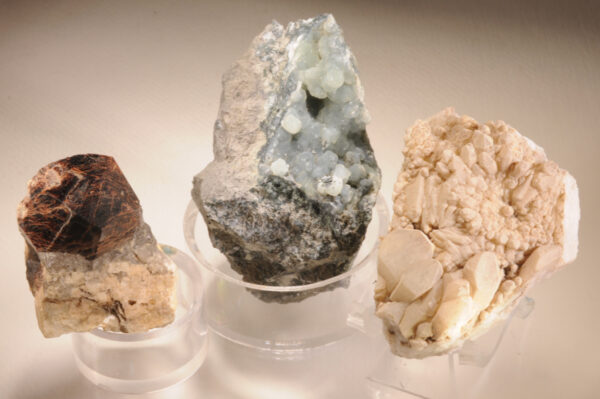 Complex quartz crystal cluster from Stafford, Connecticut. Large reddish-brown pegmatite garnet from Maine. Vug of blue-green botryoidal prehnite from New Jersey