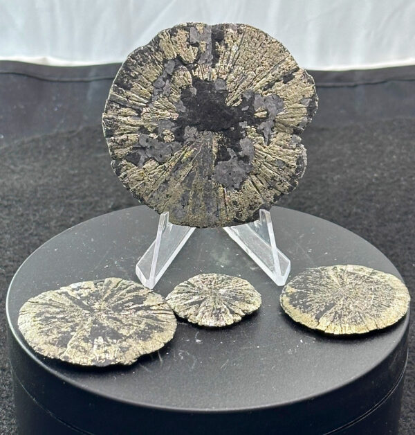 Four small isolated examples of the “pyrite suns” for which Sparta, Illinois is famous.