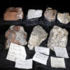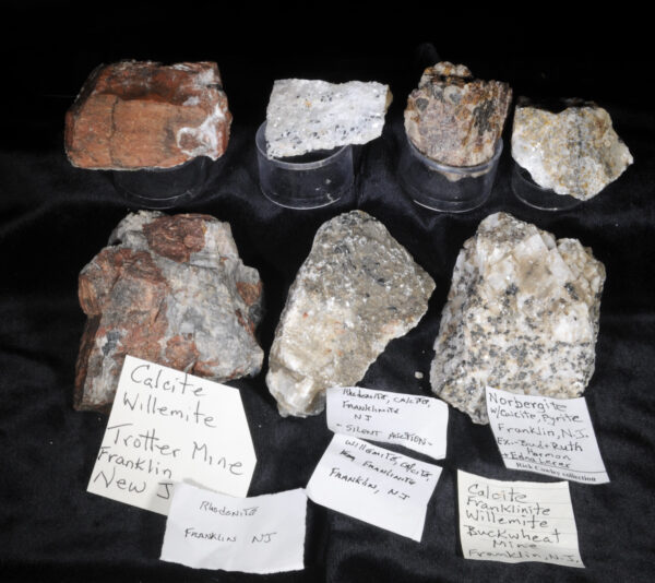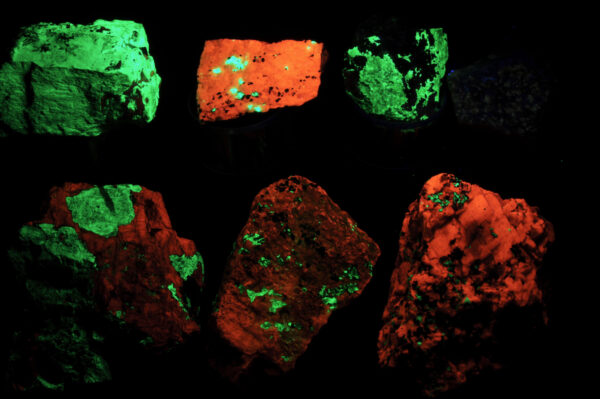 An assortment of brightly fluorescent specimens from various localities in the area of Franklin, New Jersey, USA. Examples show various combinations of calcite (fl. red-orange), willemite (fl. bright green), and norbergite (fl. pale yellow), as well as franklinite, rhodonite, and pyrite.