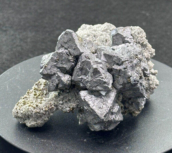 Excellent example of octahedral galena and accessory chalcopyrite on matrix from the Magmont Mine, Iron County, Viburnum Trend, Missouri, USA. EarthVision label.