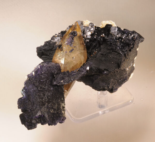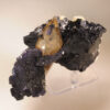 Dark purple cubic fluorite surrounding a lustrous yellow scalenohedral calcite crystal from Hardin County in the IL-KY Fluorspar District, Illinois, USA. StoneTrust label.