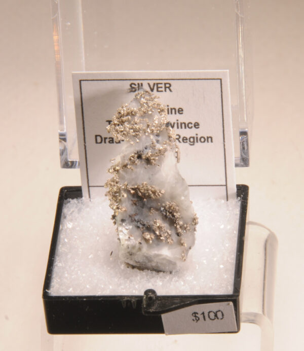 A thumbnail of a sparkly aggregate of small silver crystals etched from calcite, from the Imiter Mine in Morocco.