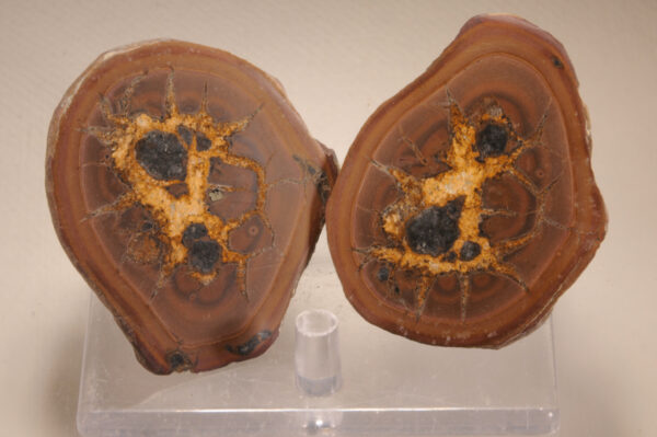 Two polished halves of septarian nodules, from Cretaceous beds in Morocco. Ex. Carolyn Reynard.