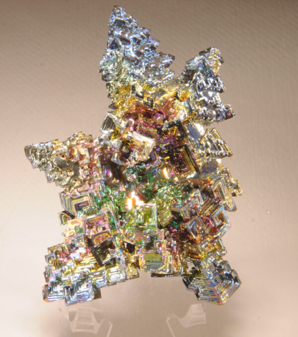 Star cluster of artificial bismuth crystals, lab grown in Germany, showing the usual rainbow luster. Label from 2012 BMC Auction.