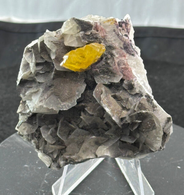 A very nice contrast of a gemmy bright yellow baryte crystal, with an attractive serrated top edge, perched on a bed of gray bladed calcite and minor pyrite, from Nandan, Dachang Tin Area, Guanxi Province, China. Well-Arranged Molecules label.